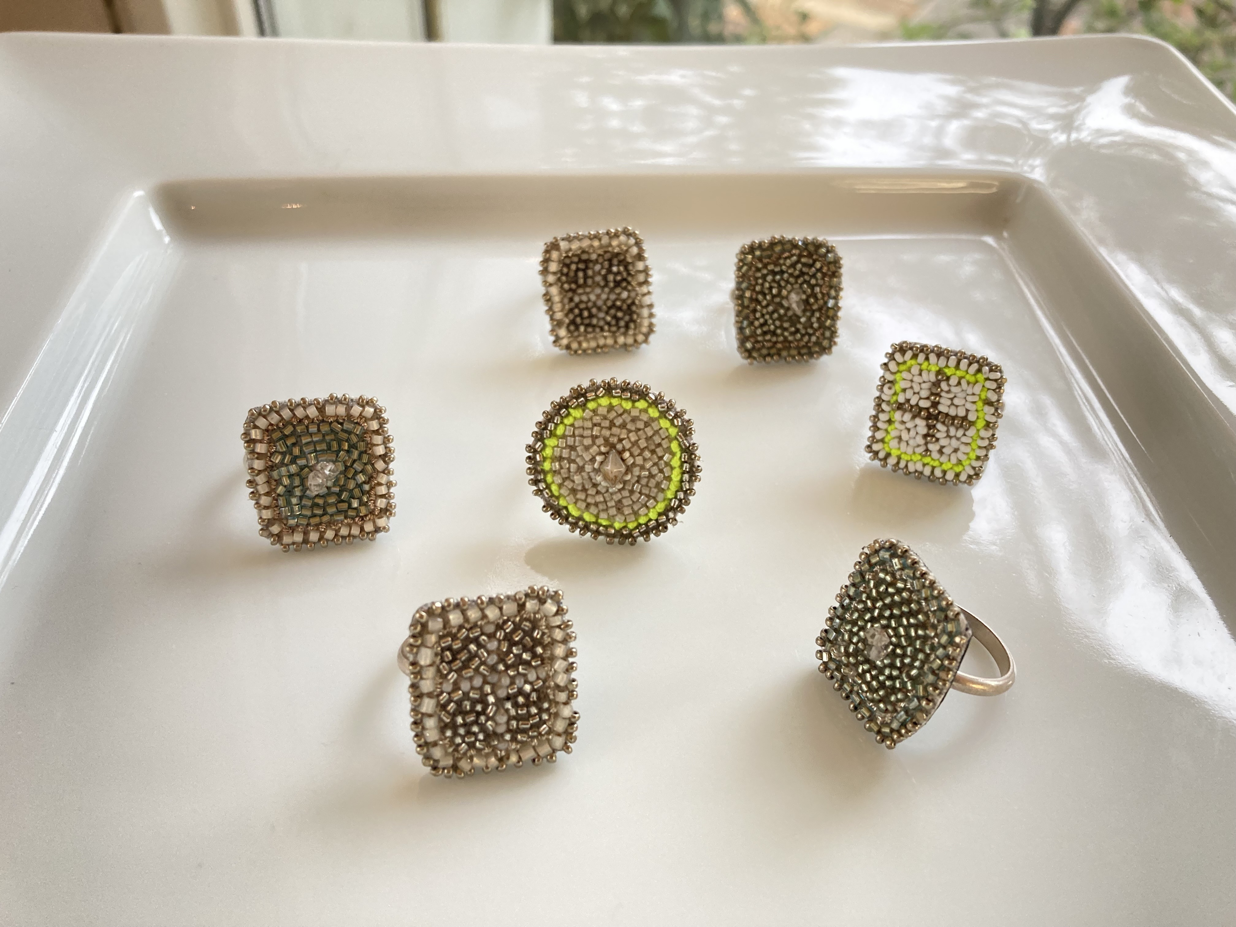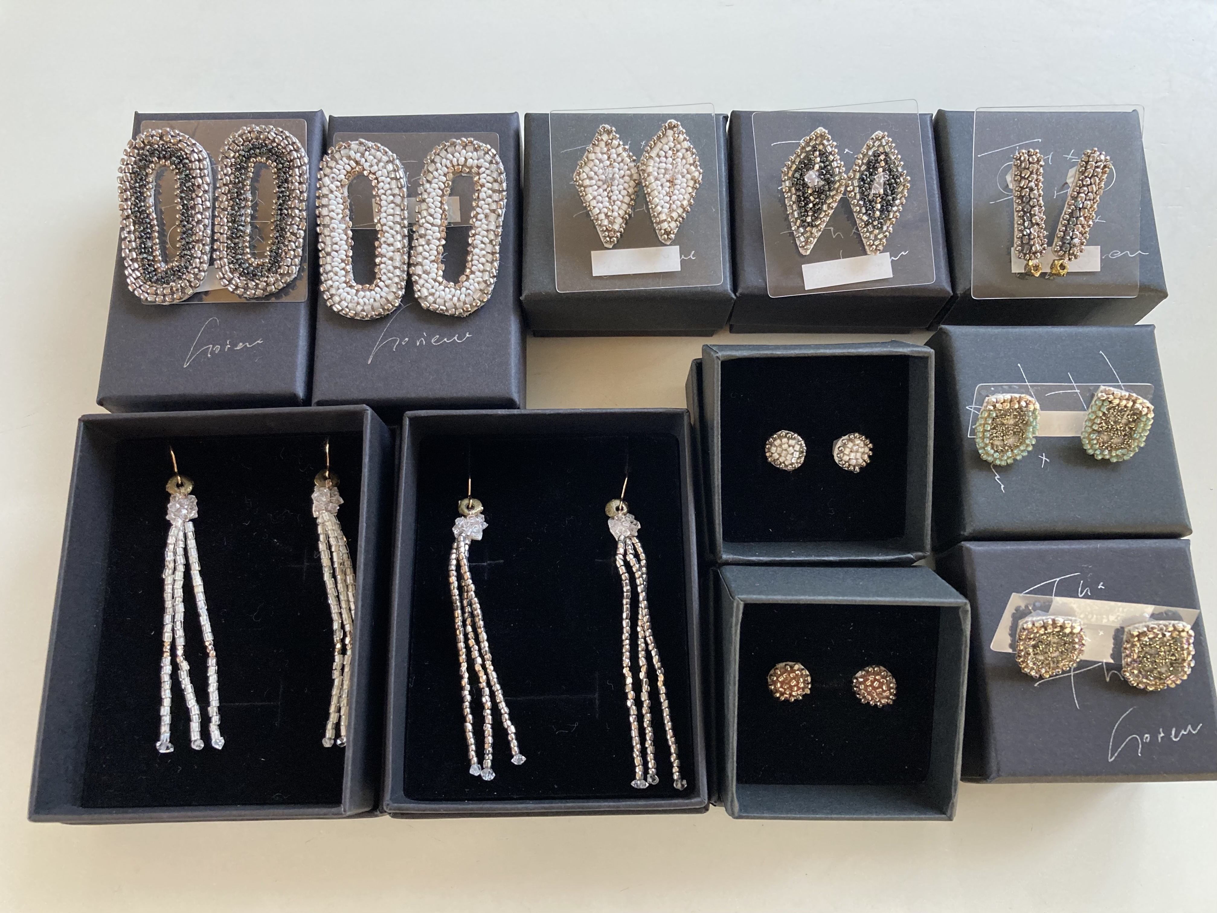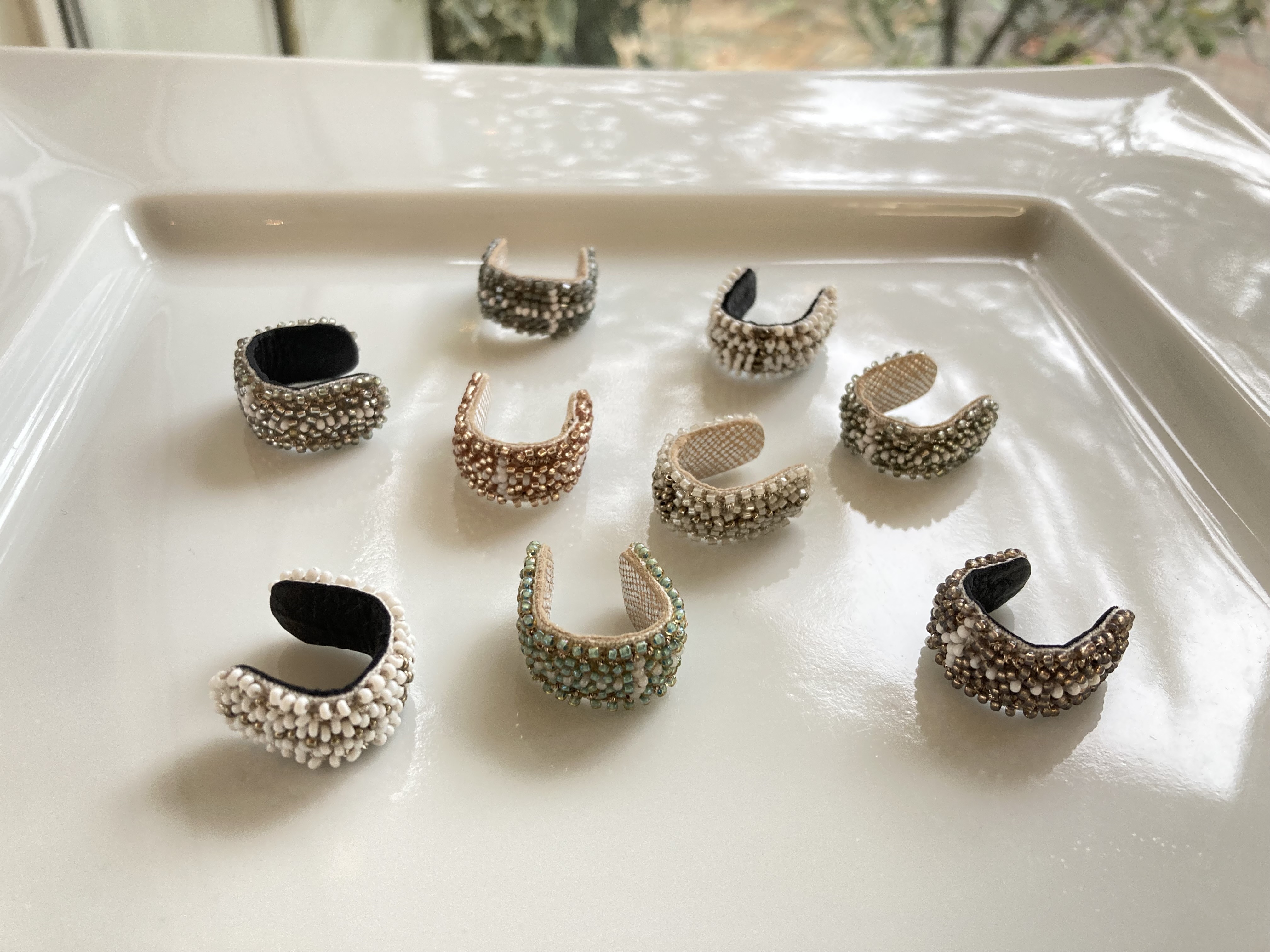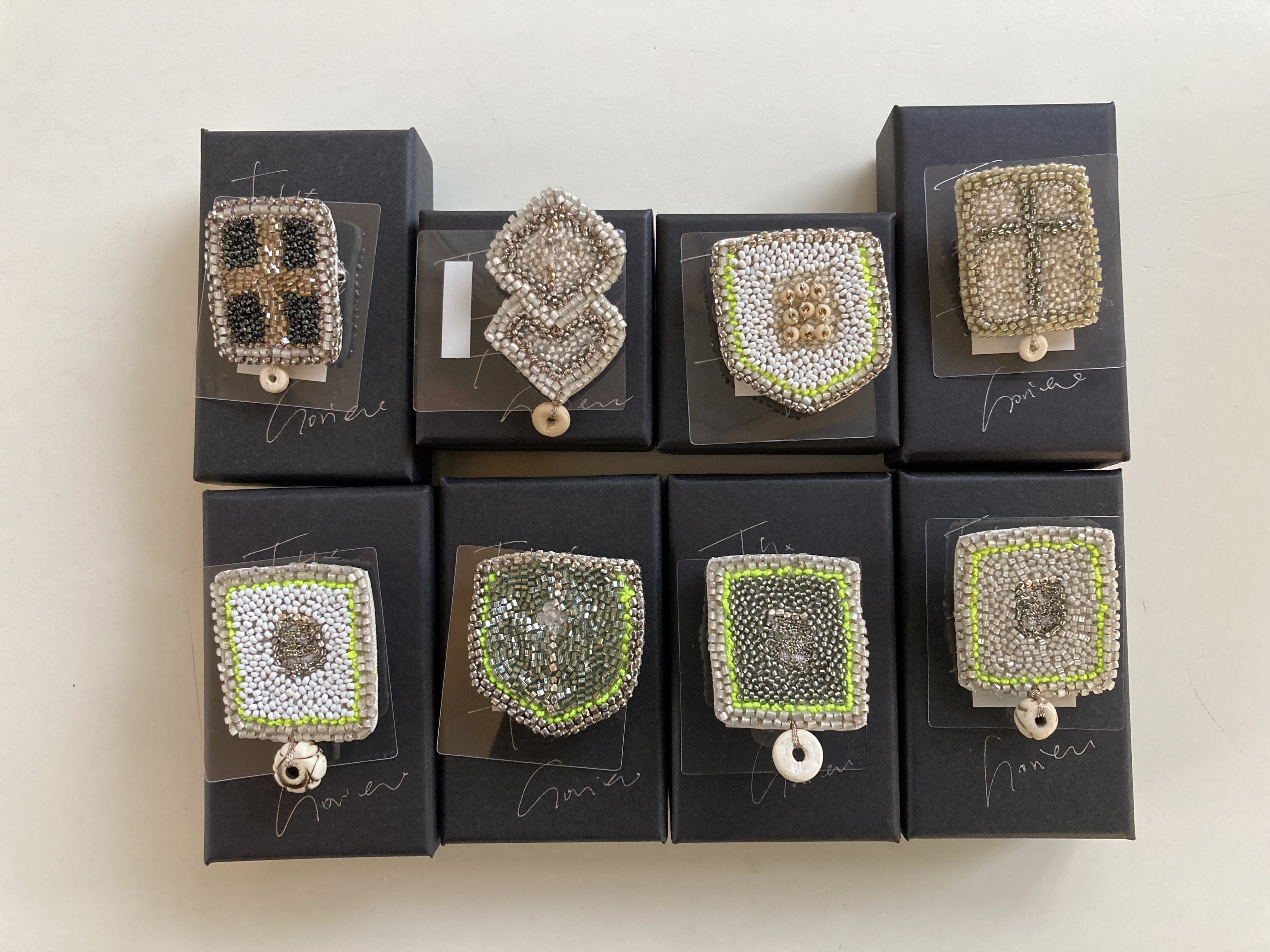 ブローチ、ネックレス、ピアス(イヤリングはオーダー)、イヤーカーフ、リング、バングルといろいろあります。